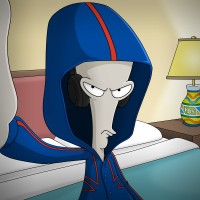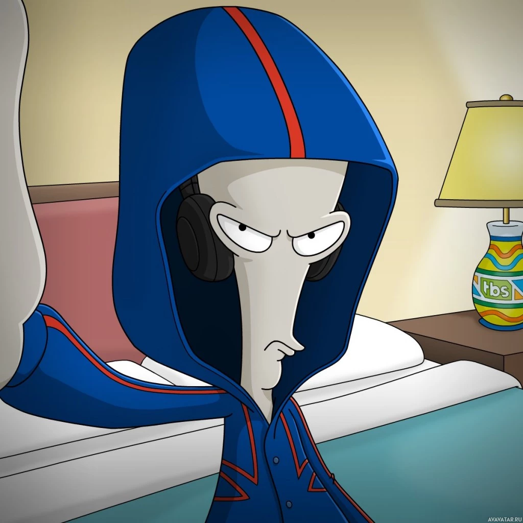 На картинке изображен анимированный персонаж по имени Роджер, который известен своим отличительным синим капюшоном и белой кожей. Он, кажется, находится в спальне, носит наушники и выражает негативные эмоции своим выражением лица. Сцена из мультфильма «Зоотопия»