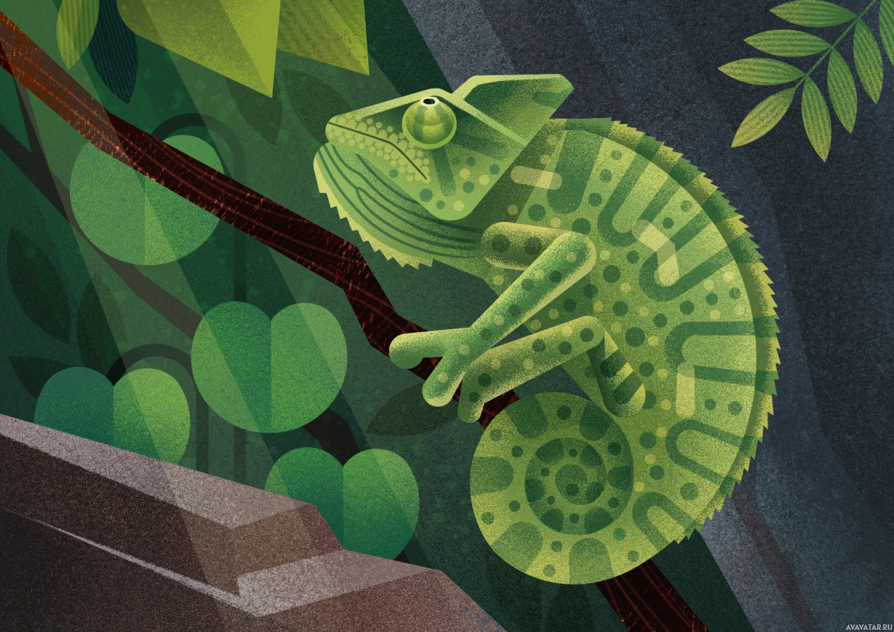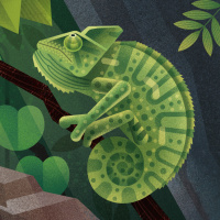 In this image, there is a chameleon perched on a branch. The chameleon is colored in hues of green and brown, with