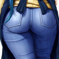 The image shows a rear view of a female character with blue hair, wearing jeans. She appears to be from an anime or manga series given the style of the artwork.