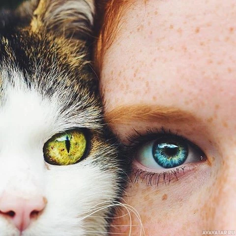 the face of a cat with distinctive yellowish-green or hazel eyes, indicating its unique coloration. The cat is positioned close to the woman's ear, appearing as if they are sharing
