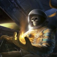 The image depicts a science fiction scene with an astronaut. The astronaut is sitting inside what appears to be the cockpit of a spacecraft, looking towards a view of the cosmos through the cockpit window, which suggests they might be on a mission or journey in outer space. The skeleton motif could imply that this scene has a darker or symbolic theme beyond its literal depiction.