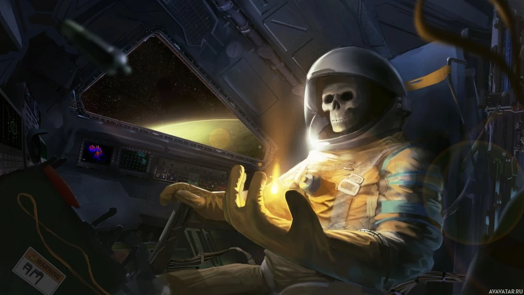На картинке изображена сцена научной фантастики с астронавтом. Астронавт сидит в кабине космического корабля, глядя на вид космоса через окно кабины, что предполагает, что они могут быть в миссии или путешествии в космическом пространстве. Мотив скелета может означать, что эта сцена имеет более темную или символическую тему, чем ее буквальное изображение.