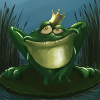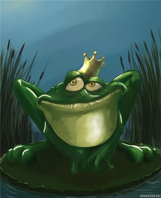 На картинке изображена стилизованная антропоморфная лягушка, сидящая на вершине водяных лилий. Он носит корону и, кажется, наслаждается водой. Фон предполагает пруд или болото, расположенное в сумерках, с тростником, видимым вдоль края воды.