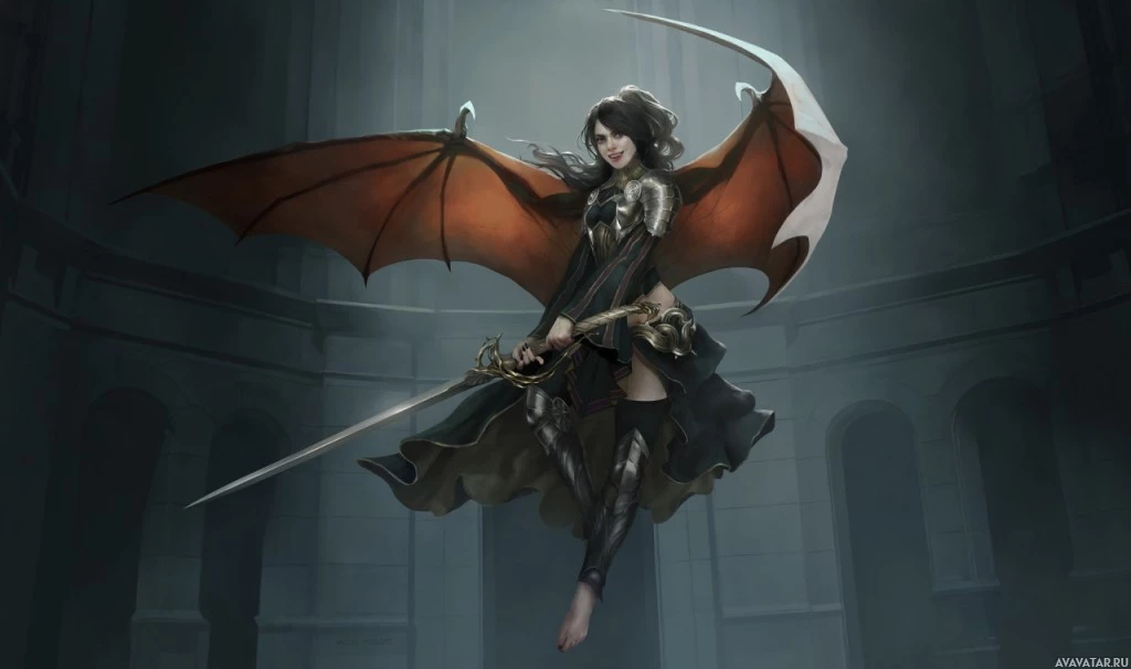 a fantasy character who appears to be a succubus, given the presence of wings and horns commonly associated with mythical beings from folklore. She is holding a sword in one hand, suggesting she might be a warrior or hunter