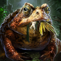 The image shows a depiction of an animal that resembles a frog or toad, but with some fantastical elements. It has a prominent