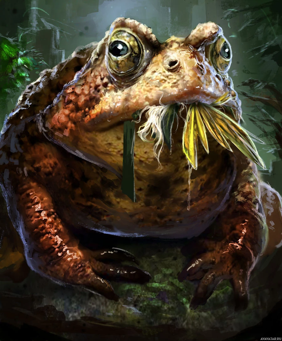 humanoid face, including eyes and a nose, which is not typical for real-life frogs or toads. This creature appears to be eating something green, possibly