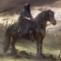 a fantasy scene. In the image, there is a knight or warrior riding on horseback across a battlefield. The character appears to be wearing armor and holding a sword, indicating they are engaged in combat or preparing for it. The background is dramatic with clouds that seem to suggest