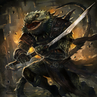 sharp teeth. He is wearing armor and holding a sword, suggesting he might be a warrior or guardian of some sort in his