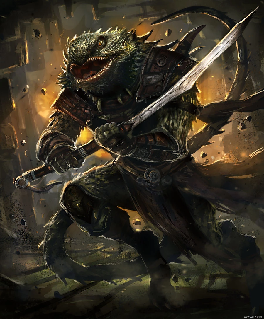 a fantasy character that appears to be a mutant. The character has a humanoid form with fish-like features, including scales and gills, as well as a prominent mouth filled with