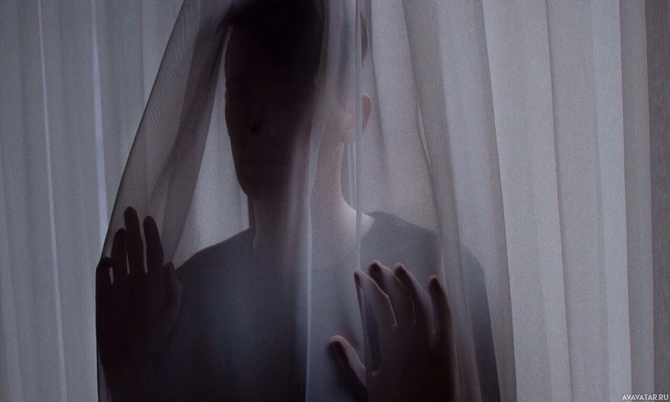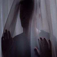 lit area. There's an eerie and mysterious quality to the image due to the veil-like curtain obscuring the person's face and body details.