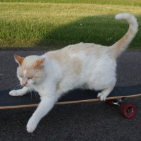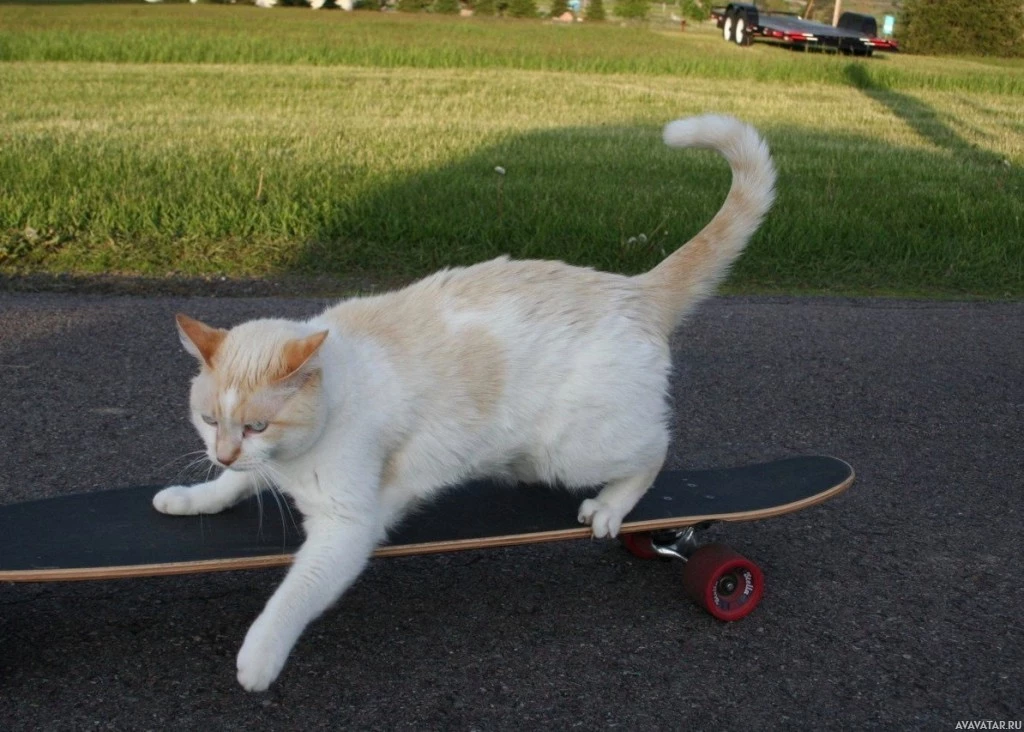 На снимке изображен кот, сидящий на скейтборде, по-видимому, пытающийся прокатиться на нем. Фон - это наружная обстановка с травой и тем, что кажется дорогой или дорожкой.