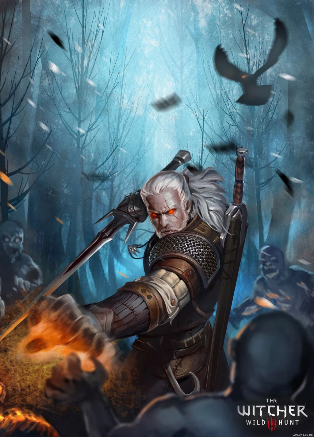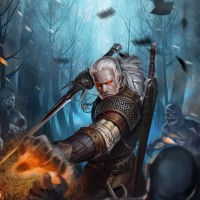 the video game "The Witcher 3: Wild Hunt," known by the name Geralt. He is depicted in his signature attire and wielding his sword, standing amidst what appears to be