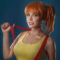 cosplay attire, specifically mimicking the style of Misty from the Pokémon franchise. They are wearing a yellow