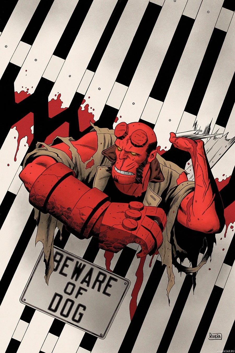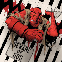 a dangerous situation involving a dog. The overall tone of the image suggests an action-packed or intense scenario, fitting for a character like Hellboy who is known for his