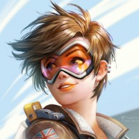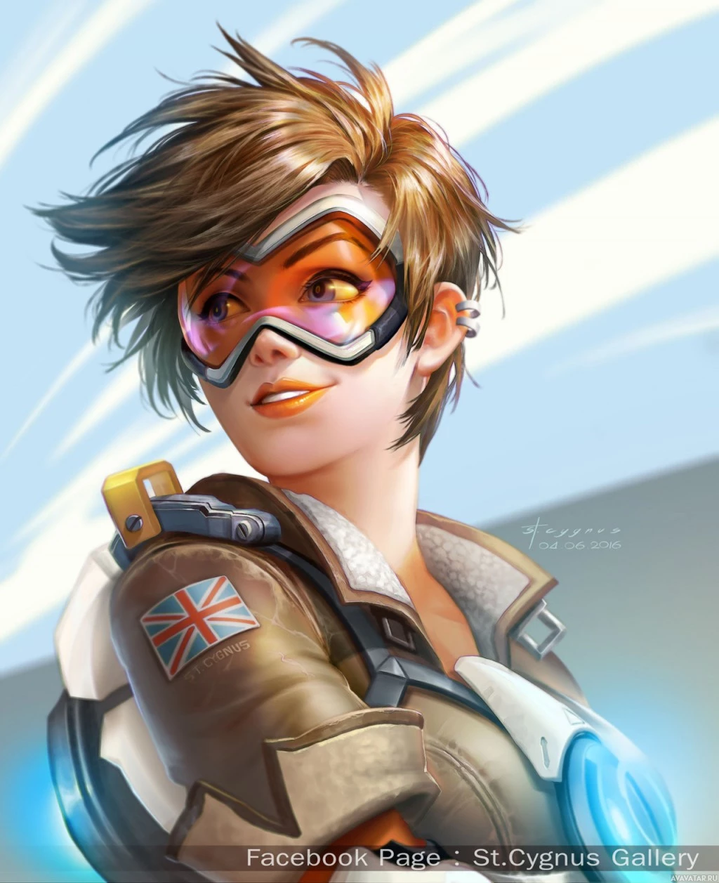 Это иллюстрация Трейсера, персонажа из видеоигры «Overwatch». Картинка показывает ее в ее культовой позе со скрещенными руками, носящими ее фирменную броню и очки. У нее веселое выражение лица и, кажется, она смотрит прямо на зрителя.