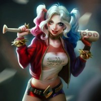 Harley Quinn. She is standing with a bat in her right hand, suggesting she may be preparing for combat or action. Her attire includes a red and white jacket over a black shirt, with