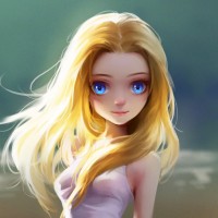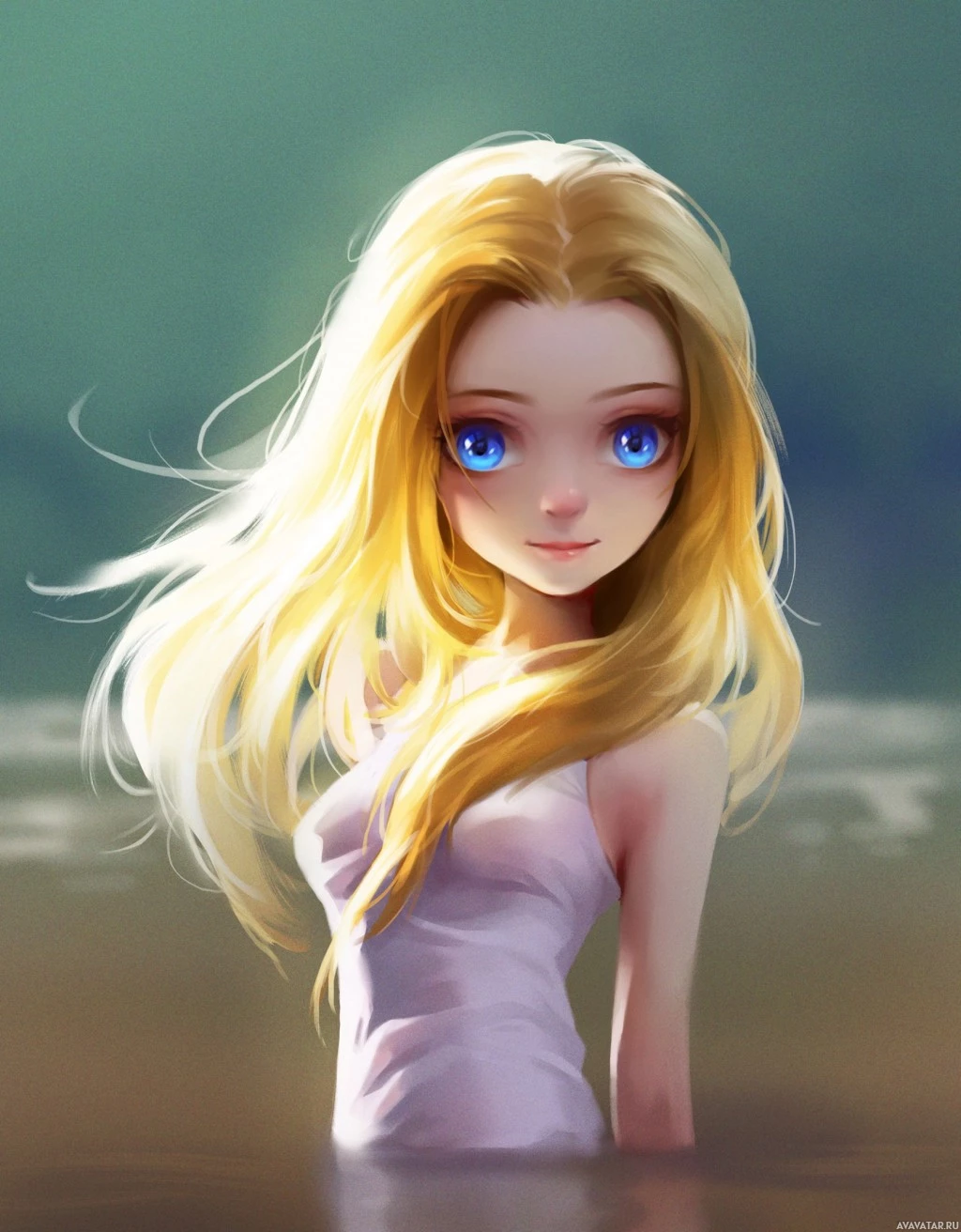 blonde hair and blue eyes. She appears to be at the beach, as evidenced by her presence in shallow water and