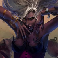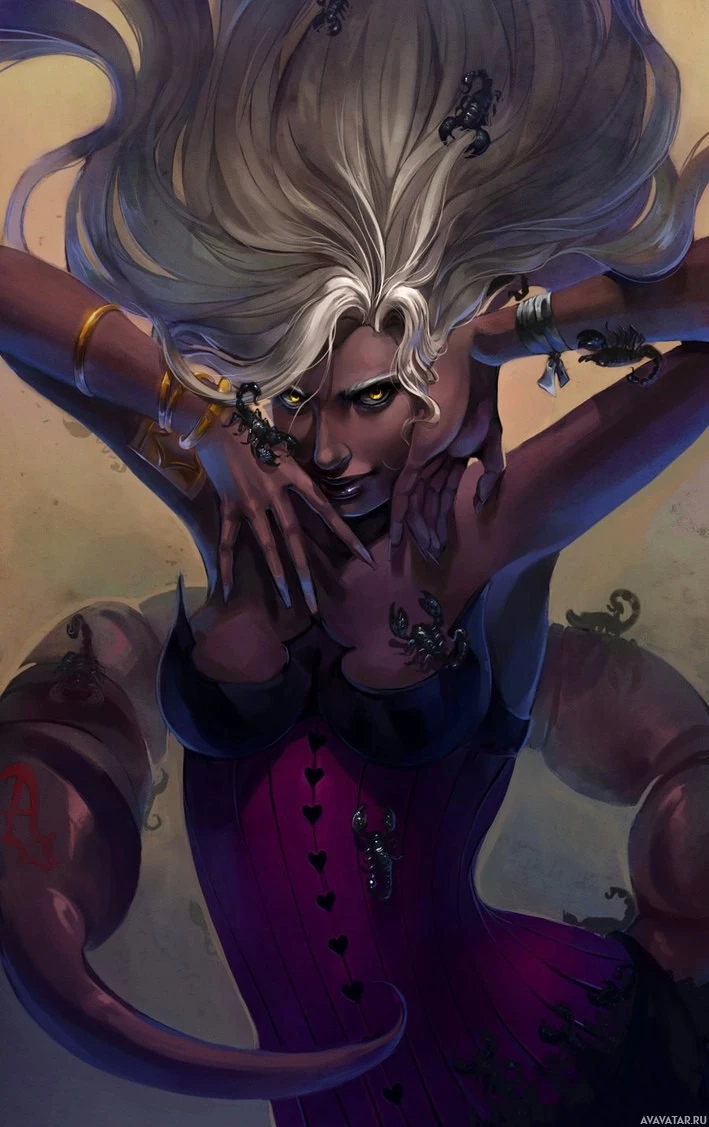 long hair and a stylized appearance, possibly inspired by characters from stories or games. There are also indications of scorpion-like appendages on her arms, suggesting she may have some sort of creature or magical