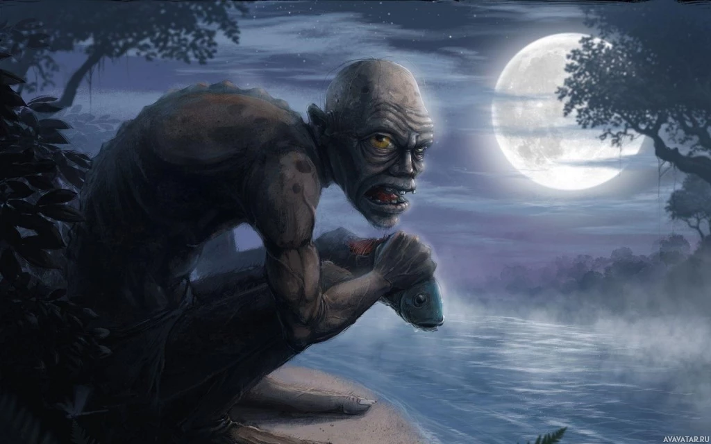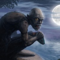 moonlit scene with a figure that resembles Gollum from "The Lord of the Rings" sitting on a rock near the water. In front of him is a fish, which he appears to be looking at intently. The backdrop includes trees and foliage under