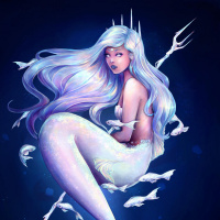 fish swimming in formation, suggesting an interaction between the mermaid and these aquatic creatures. The background is dark blue with light speckles that might represent