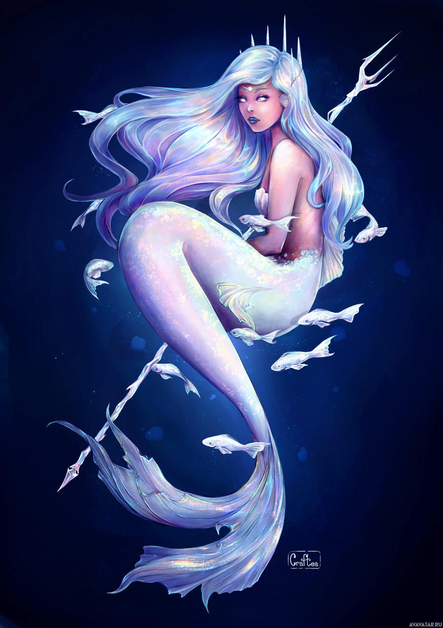 white hair. She has a tail that resembles scales, like a fish's, and she appears to be floating or gliding underwater. Around her, there are several small