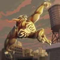 an animated character in a superhero costume, resembling that of Spider-Man, but with a humorous twist—the face is replaced by the body of a dog. This character appears to be leaping into action against a city skyline backdrop, possibly engaging in some sort of heroic or