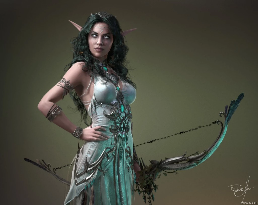 long hair that falls over her shoulders and a confident expression on her face. She seems to embody the spirit of an archer or huntress. The artwork features detailed textures and
