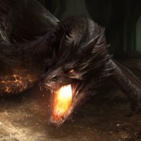 the fantasy universe of Middle-earth, likely inspired by the works of J.R.R. Tolkien. In the center of the image is a dragon with its wings spread wide and its head lowered towards the ground. The dragon has