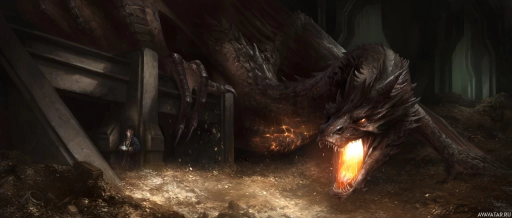 indoor setting, with broken walls and rubble on the floor, suggesting that some sort of battle or struggle has recently taken place here. The scene conveys a sense of danger and tension, which is characteristic of epic fantasy stories like "The Hobbit" and "The Lord of the Rings," where such encounters with powerful dragons are common.