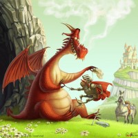 a fantasy scene with a dragon sitting on the grass in what appears to be a countryside setting, possibly near a castle. A warrior is standing in front of the dragon, holding his sword at the ready but looking relaxed and smiling. There's also an illustration of a horse nearby. The overall mood of the picture seems peaceful and friendly, contrary to