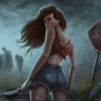 The image shows a woman standing on a road with her back turned to the viewer. She is holding a knife in one hand and appears to be looking over her shoulder. In front of her, there's a sign that reads "STOP." Behind her, we can see figures that look like zombies or