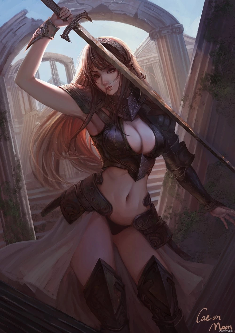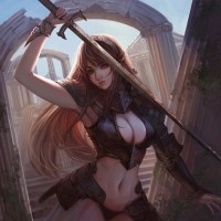 a female character who appears to be a warrior or adventurer. She is holding a sword in her right hand and has