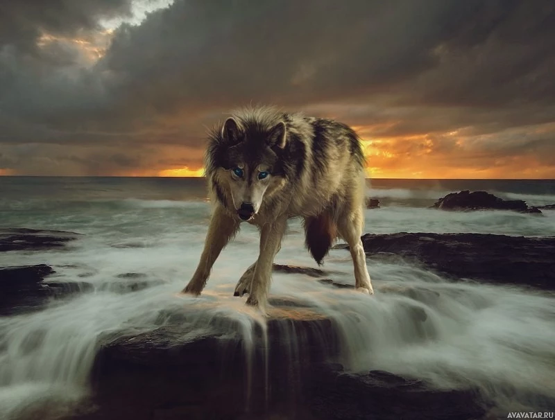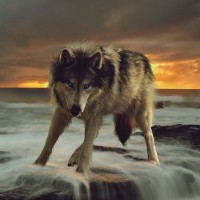 dark clouds and a colorful sunset or dawn in the background. The wolf stands confidently on the rocks near the water's edge, looking directly at the camera, giving