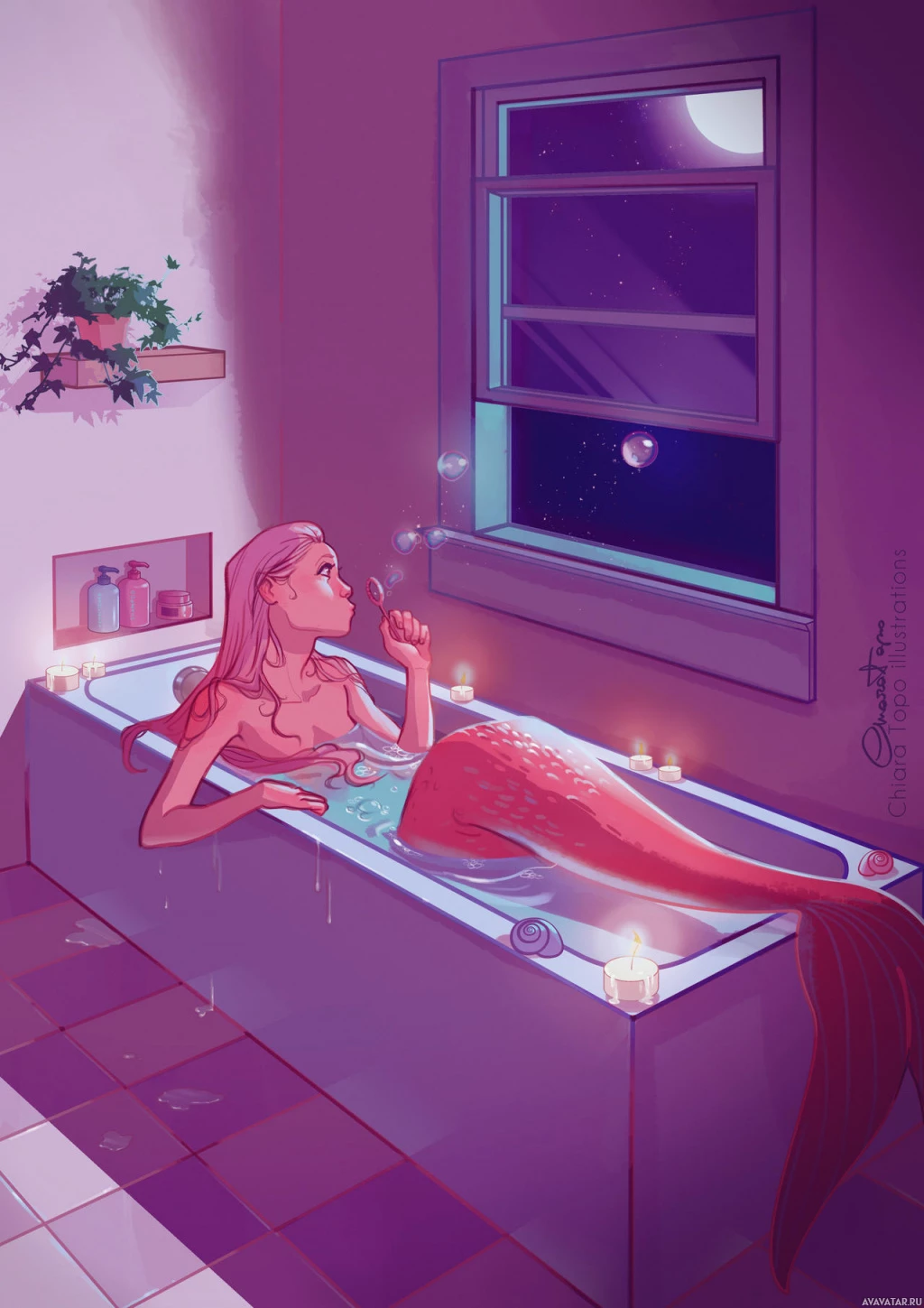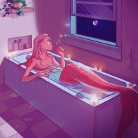 pink hair and is lying in a bathtub, appearing relaxed. There are candles lit around her, providing a warm,