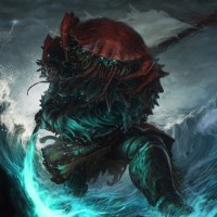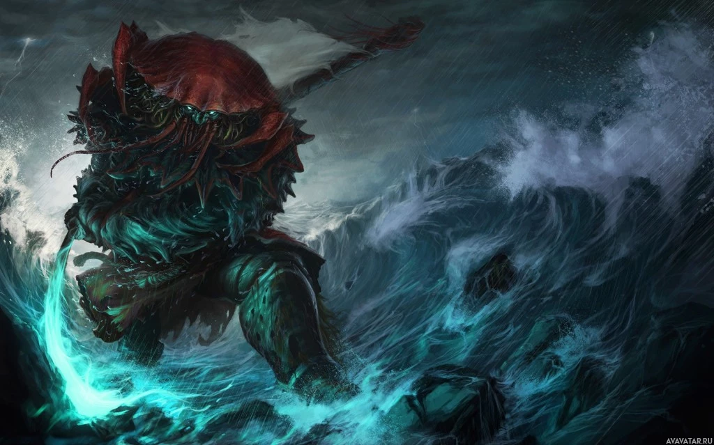 an armored figure standing on a rock amidst turbulent waters with waves crashing around it. This character appears to be a powerful being, possibly a deity or