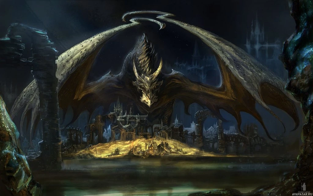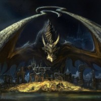 a fantastical scene with a large dragon as the central figure. It appears to be set in a dark, foreboding environment that could be interpreted as a cave or dungeon setting, evoking