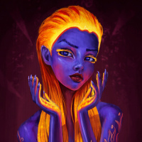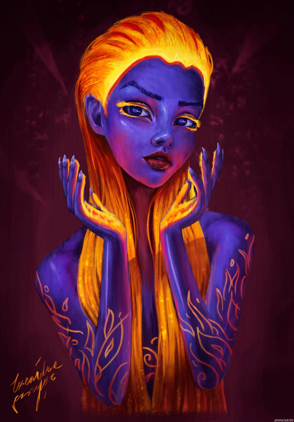 a female figure with vibrant orange hair and striking blue eyes, adorned with elaborate tattoo-like patterns across her shoulders, chest, and arms. She has purple skin and