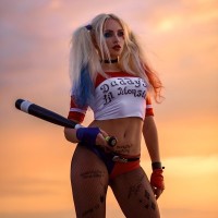 blonde hair with blue highlights, a bat-shaped tattoo on the left arm, and holding a baseball bat. The person is standing against a sunset background, which creates