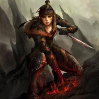a young woman who appears to be a warrior or adventurer. She is holding a sword in her right hand and has her left hand ready for combat. The character is wearing