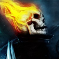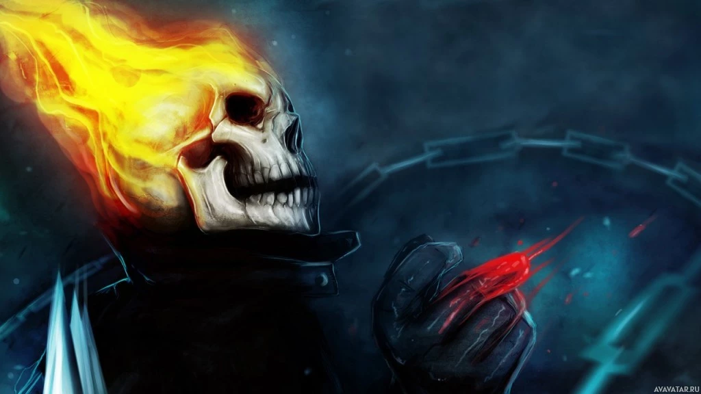 a skull for a head, which is characteristic of his appearance in the comics and media related to this superhero. A flame or fire is coming out from the top of the skull, suggesting his