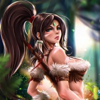 a warm environment like a jungle, and there are elements of nature surrounding her, such as trees and foliage. The style is reminiscent of modern anime art, characterized by its