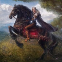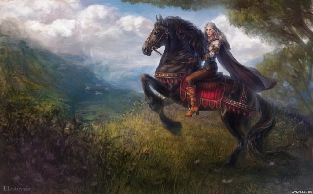 the video game "The Witcher 3: Wild Hunt," specifically Ciri (Cirilla Fiona Elen Riannon), who is known for her ability to possess the body of another person or creature. In this depiction, she is shown on horseback in a scenic and