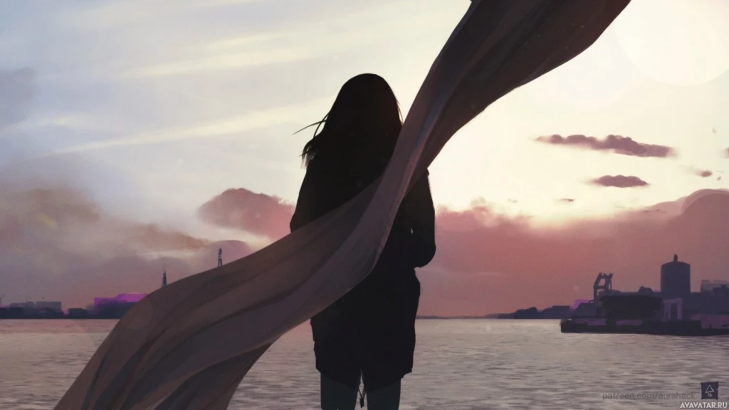 a silhouette of a girl standing by the water at what appears to be sunset or sunrise, given the warm hues in the sky. She is facing away from the viewer and looking out towards the horizon where the sun is partially visible. Her hair seems to be blowing slightly due to the breeze. The setting suggests a peaceful reflection moment by the water's edge during