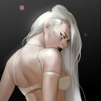 white hair and a fantasy-like appearance. She is wearing a revealing outfit that suggests she might be a character from