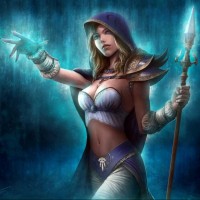 a female character who appears to be from the Warcraft universe, specifically resembling Jaina Proudmoore. She is wearing armor and a cape, which suggests she might be a warrior or mage-type character. In her right hand, she is holding what seems to be a staff or wand emanating blue light, indicating that she might have