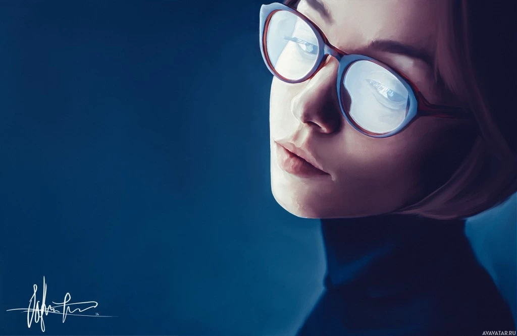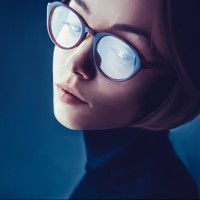 The image depicts a woman wearing glasses. She appears to be looking away from the viewer with