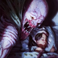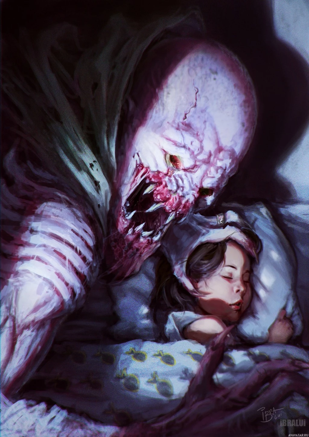 a young child who appears to be asleep. The creature has an exaggerated, menacing appearance with