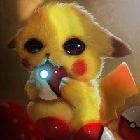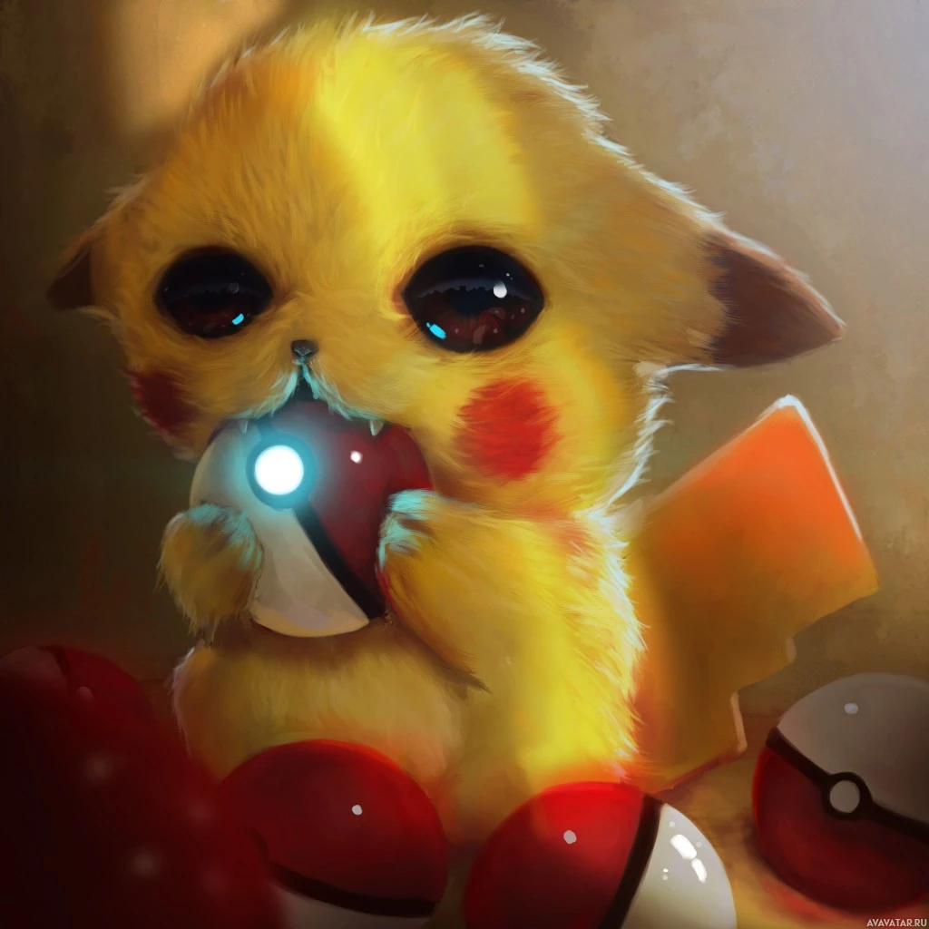 large eyes and black markings on its face, holding an electric-type Pokéball in one hand. There are additional Pokéballs surrounding Pikachu's feet, creating a playful and cute scene that is reminiscent of the Pokémon franchise.