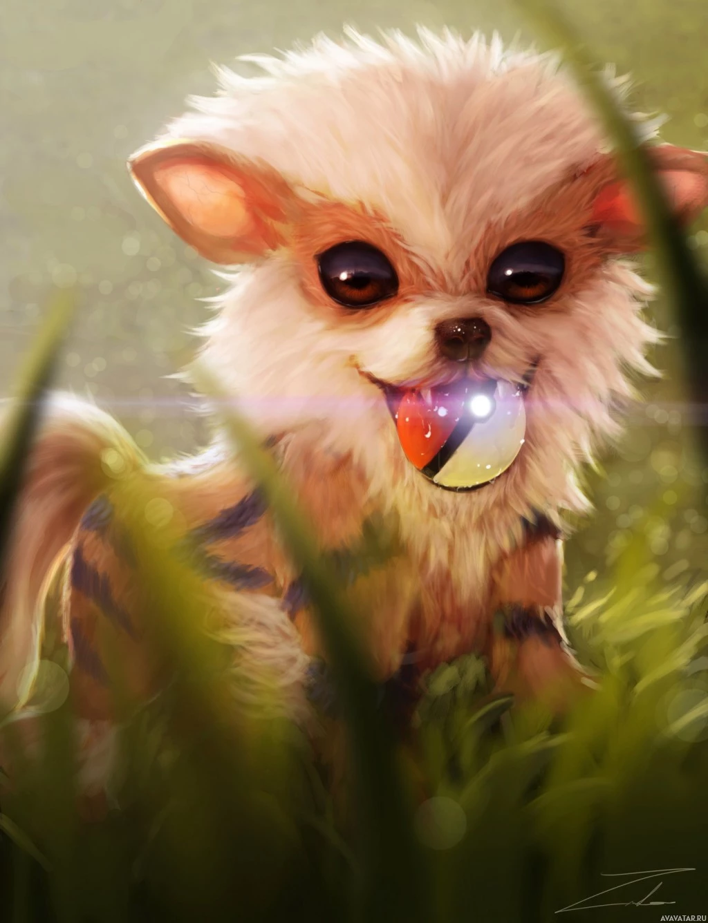 a natural setting. The character appears to be smiling and holding what seems to be a Pokeball in its paw, suggesting it might be related to the Pokémon franchise, which features animals that can be caught inside these balls to battle against other Pokémon.