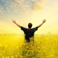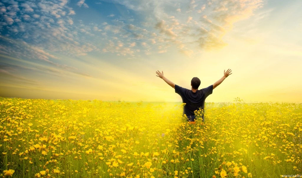 На снимке изображен человек, стоящий в поле, наполненном желтыми цветами, вероятно, подсолнухами. Человек смотрит в сторону от камеры и поднимает руки вверх к небу. Похоже, что сверху идет яркий источник света, создающий впечатление, что фотография была сделана во время восхода или заката солнца из-за теплого свечения. Сцена вызывает чувство радости, свободы или благодарности.